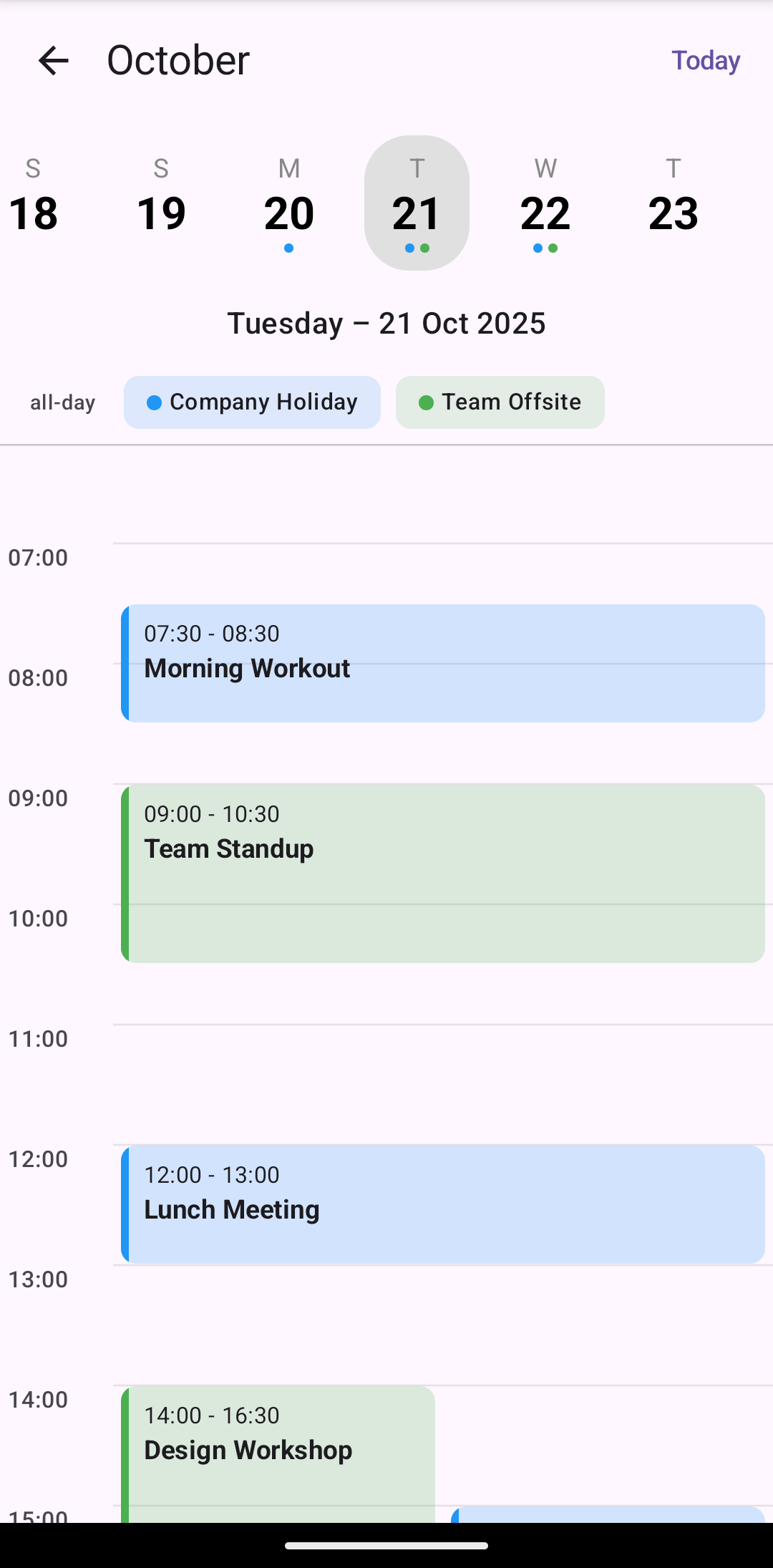 Week Header — A horizontally scrollable strip of day cells. Colored dots beneath each day show which accounts have events on that day (up to three colors). Tapping a day scrolls the day view to match, and vice versa — keeping these synchronized without scroll-fighting took careful coordination.