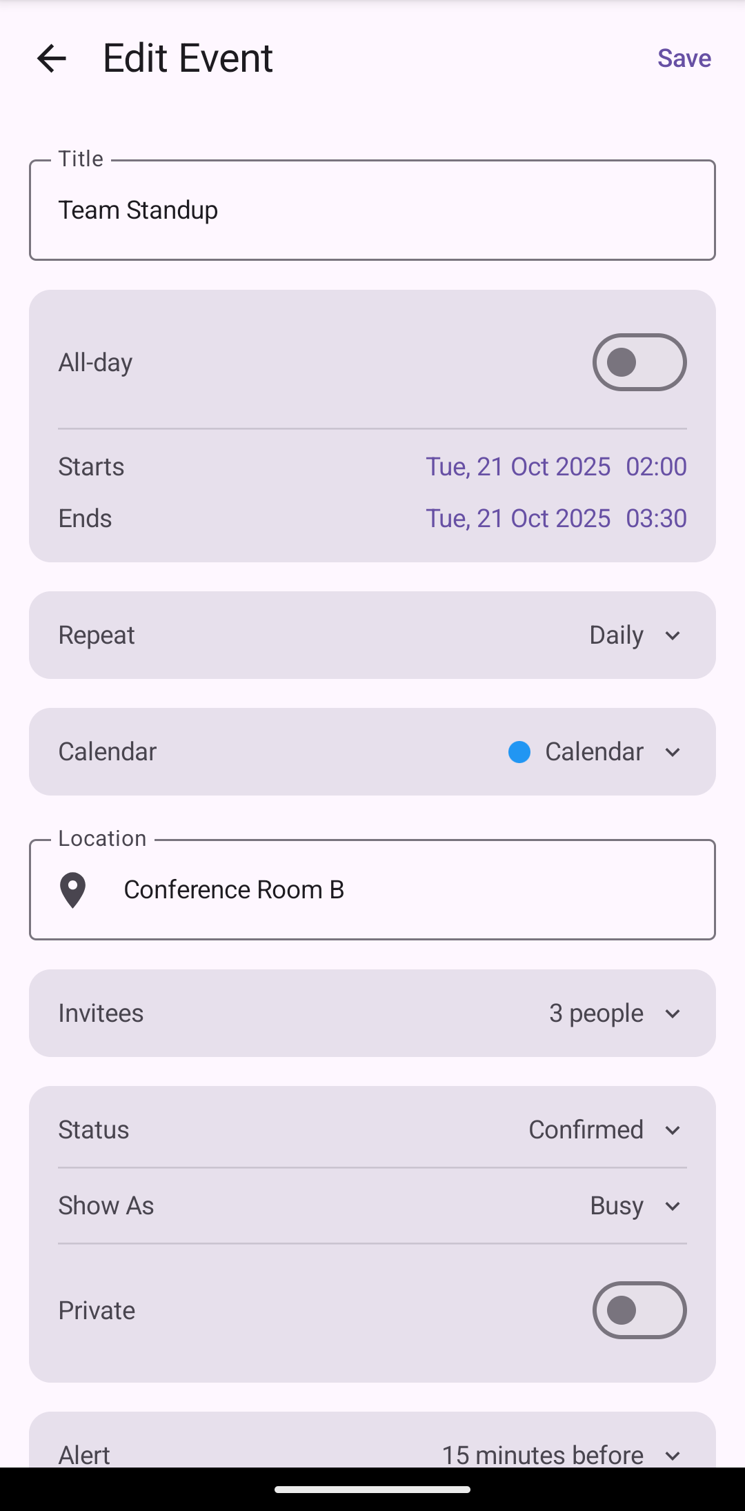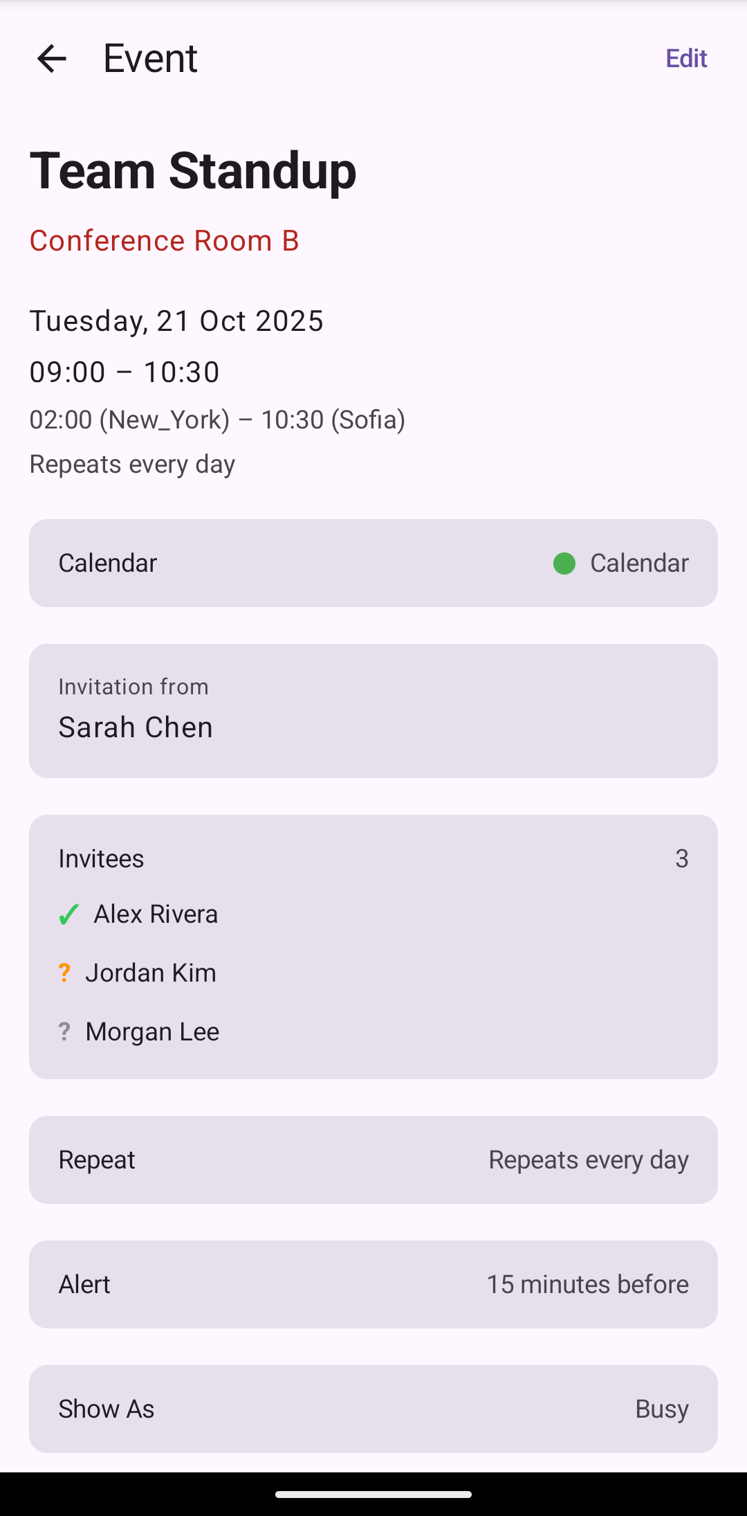 Day/Multi-Day View — A vertical timeline showing events as positioned cards. On phones it shows one day, on foldables two, and on tablets three columns side by side. This is the most complex view. When you drag an event near the edge of the screen, the view automatically scrolls to the next or previous day — getting this smooth edge-scrolling right across platforms was one of the trickier parts.