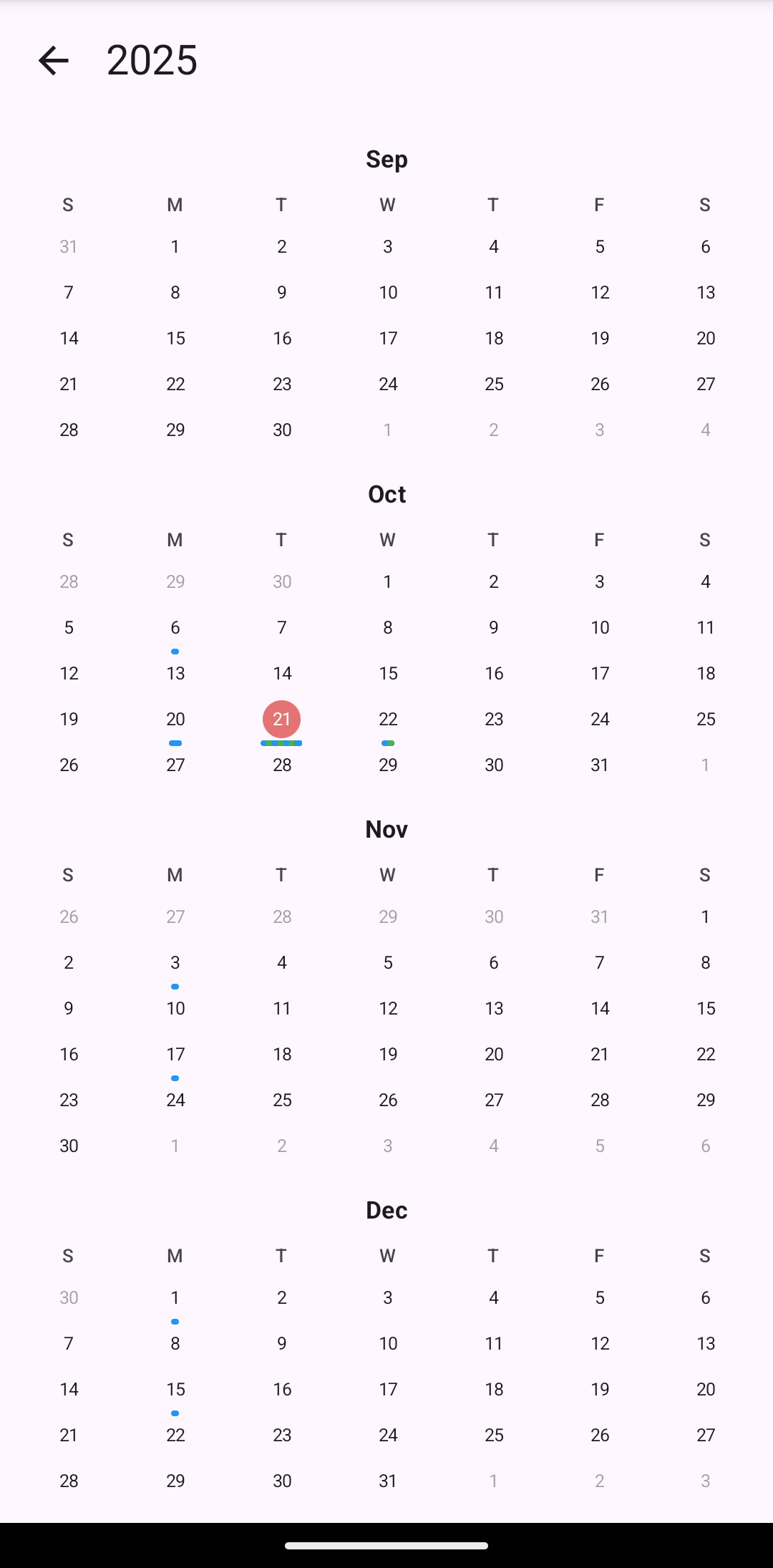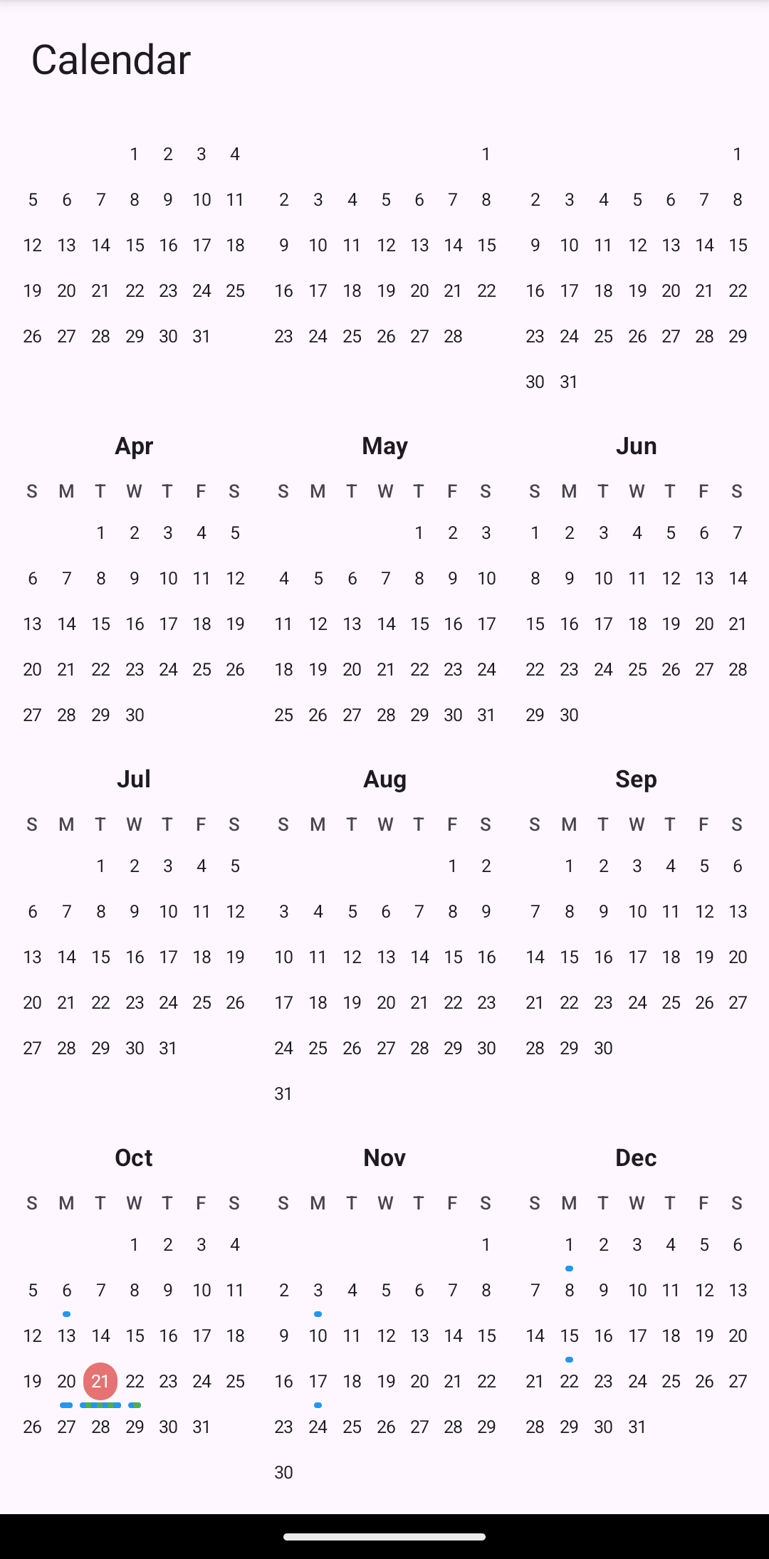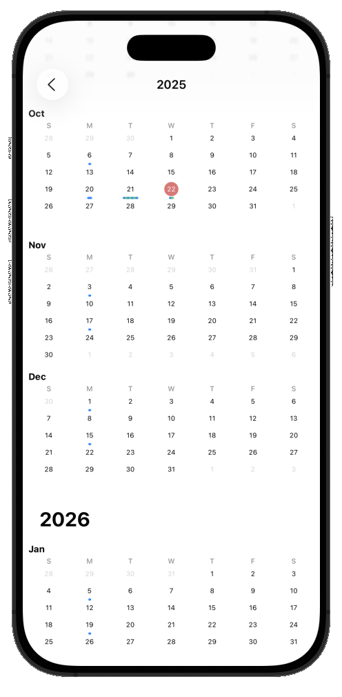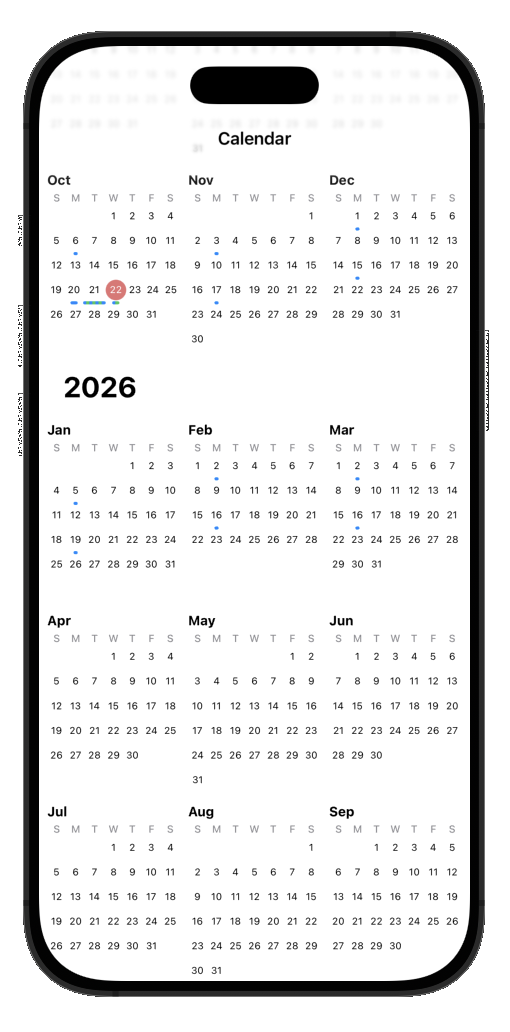 Year View — A scrollable list of months, with a compact layout (3 months per row on wider screens). Tapping a month navigates into it.