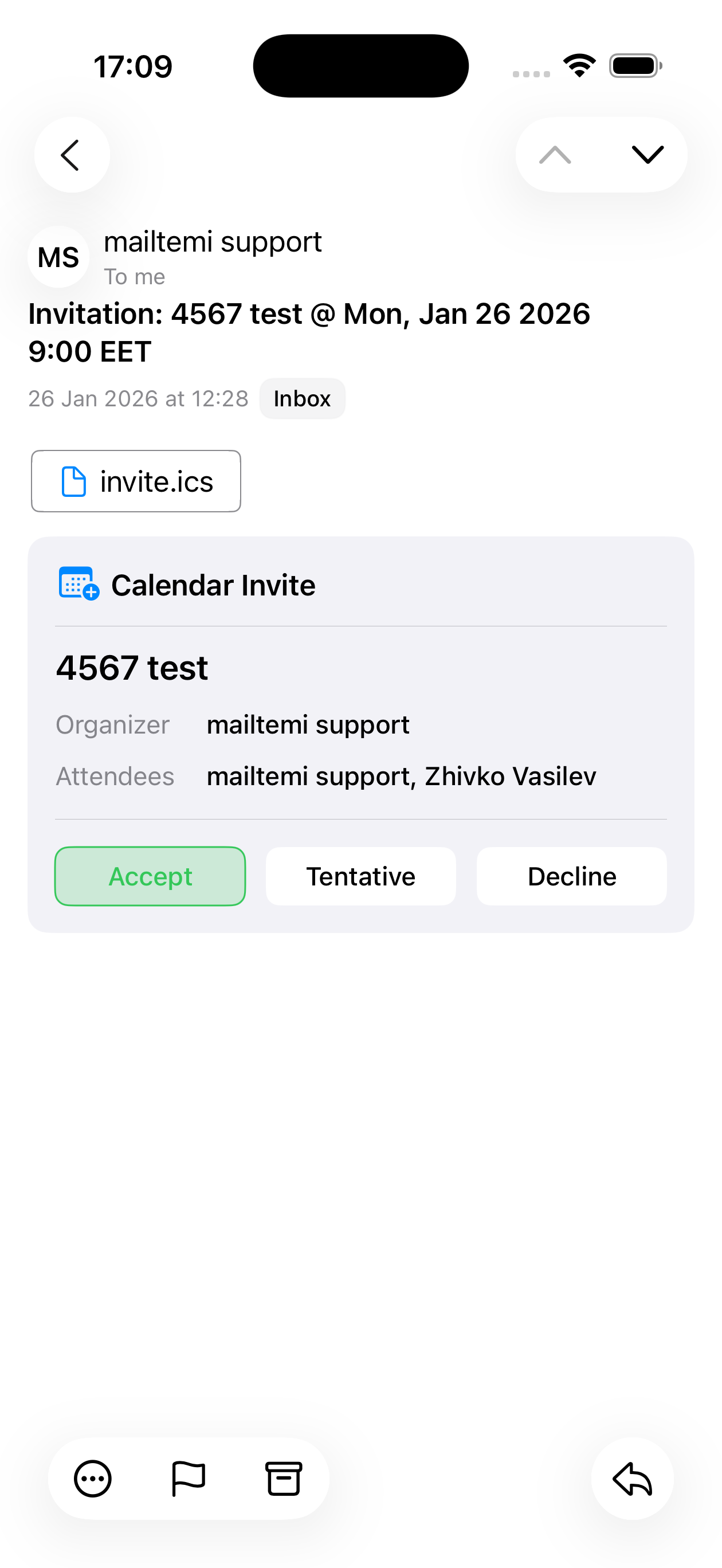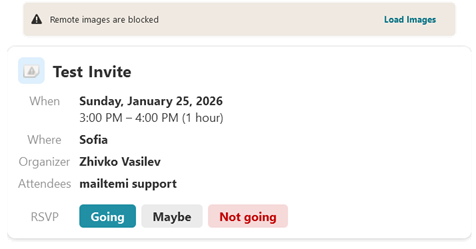 The first end-to-end workflow is running in development. Calendar invitations — the iTIP protocol — are functional for CalDAV. The client parses an incoming .ics invite attachment, converts it through the JSCalendar-CalDAV adapter, and presents it in the UI. From there, the user can accept, tentatively accept, or decline — and the client generates and sends the appropriate iTIP response message back.