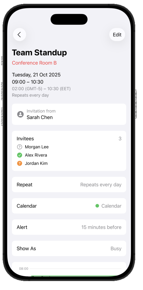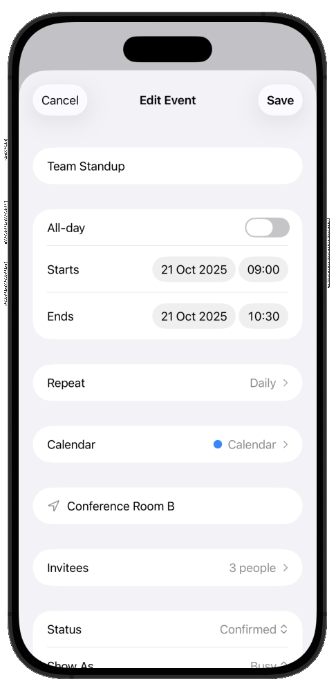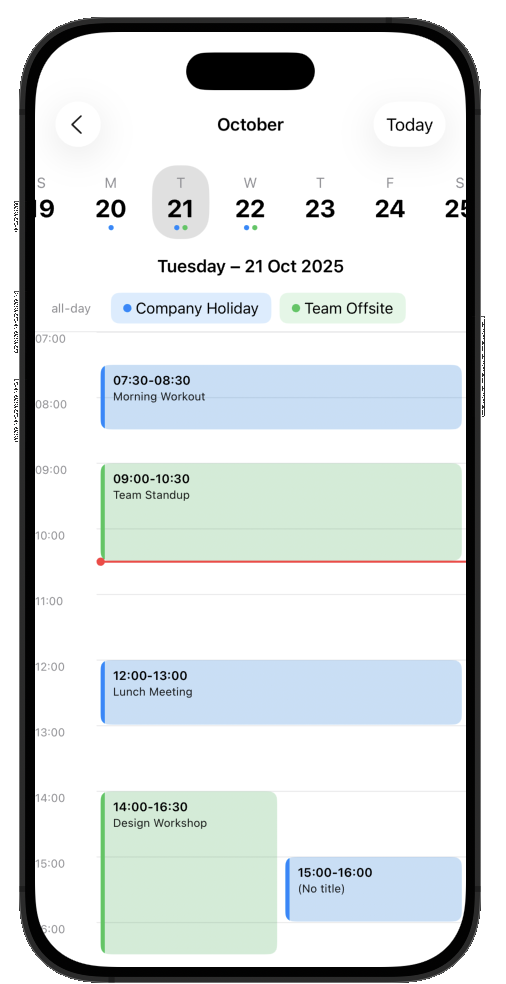 All views are fully native: SwiftUI on iOS/iPadOS/macOS and Jetpack Compose on Android. They share the same design and behavior, but each uses its platform’s native gestures and components. Drag-and-drop uses haptic feedback, events show resize handles when selected, and a ghost effect follows your finger during a move.