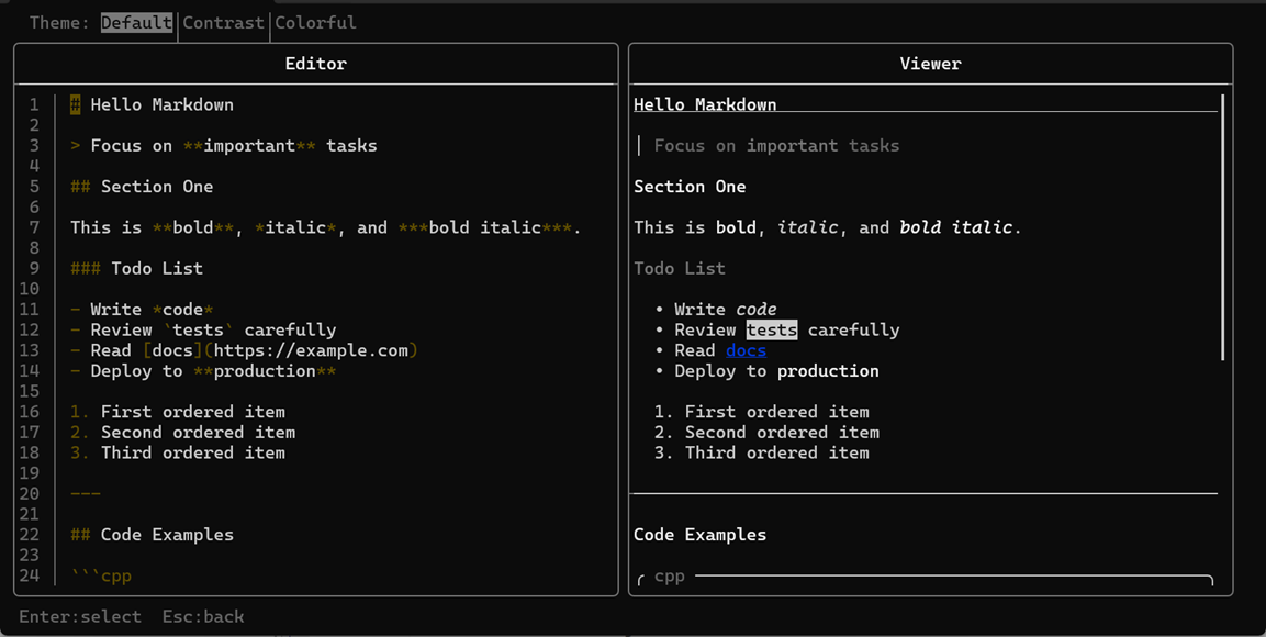 Three-pane view — TUI markdown viewer