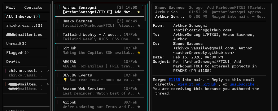 The HTML-to-markdown conversion started as an experiment that did not look very promising — plain text output from email HTML was not pleasant to read. But after polishing the converter and adding the beautification step, it became genuinely comfortable. The terminal client has since become a surprisingly practical way to triage the morning inbox — three-pane layout, keyboard-driven navigation, read and archive and move on. Its markdown rendering component was extracted and open-sourced as MarkdownFTXUI, MIT licensed.